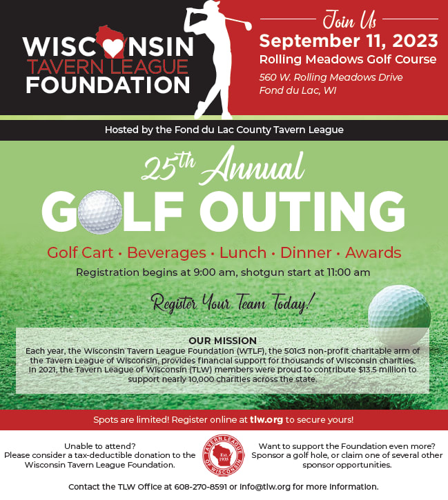 Help us impact lives in Wisconsin by joining us as a golfer at the 25th Annual Wisconsin Tavern League Foundation State Golf Outing on September 11, 2023. The event is hosted by our friends at the Fond Du Lac County Tavern League.